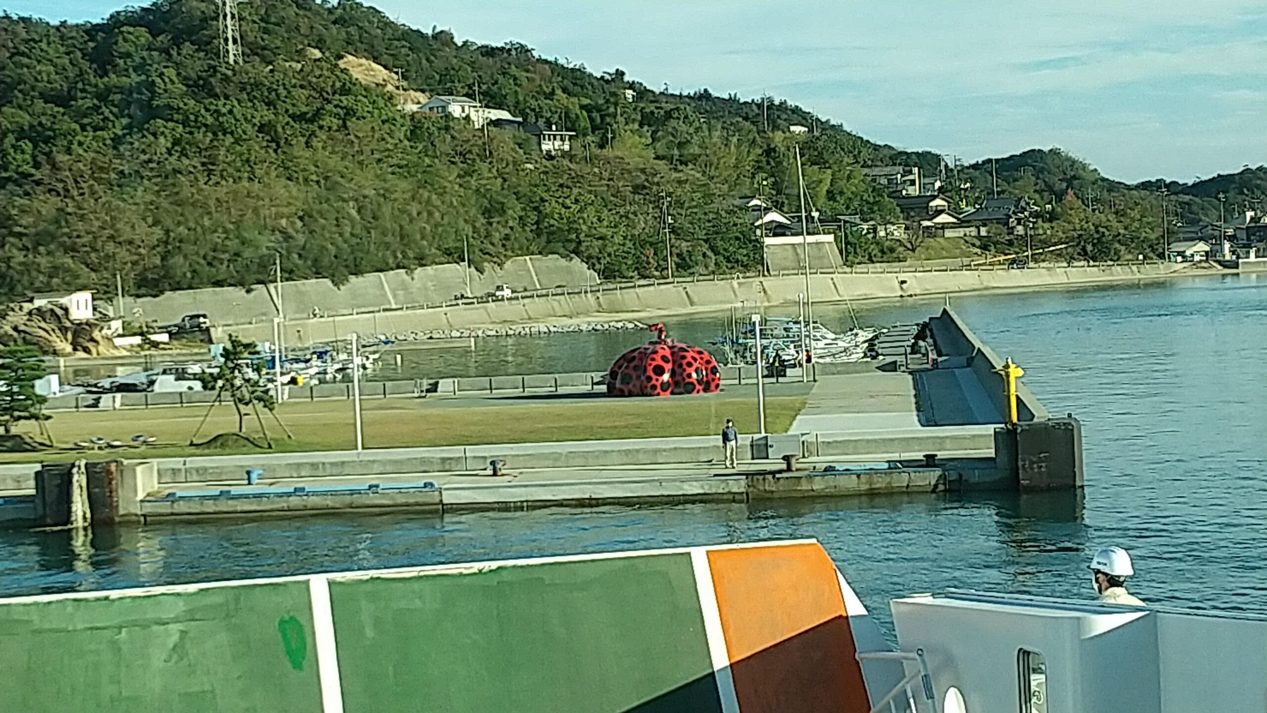 真っ先に出迎えるアートは草間彌生作品の赤の下地に黒い水玉とくりぬかれたカボチャです。